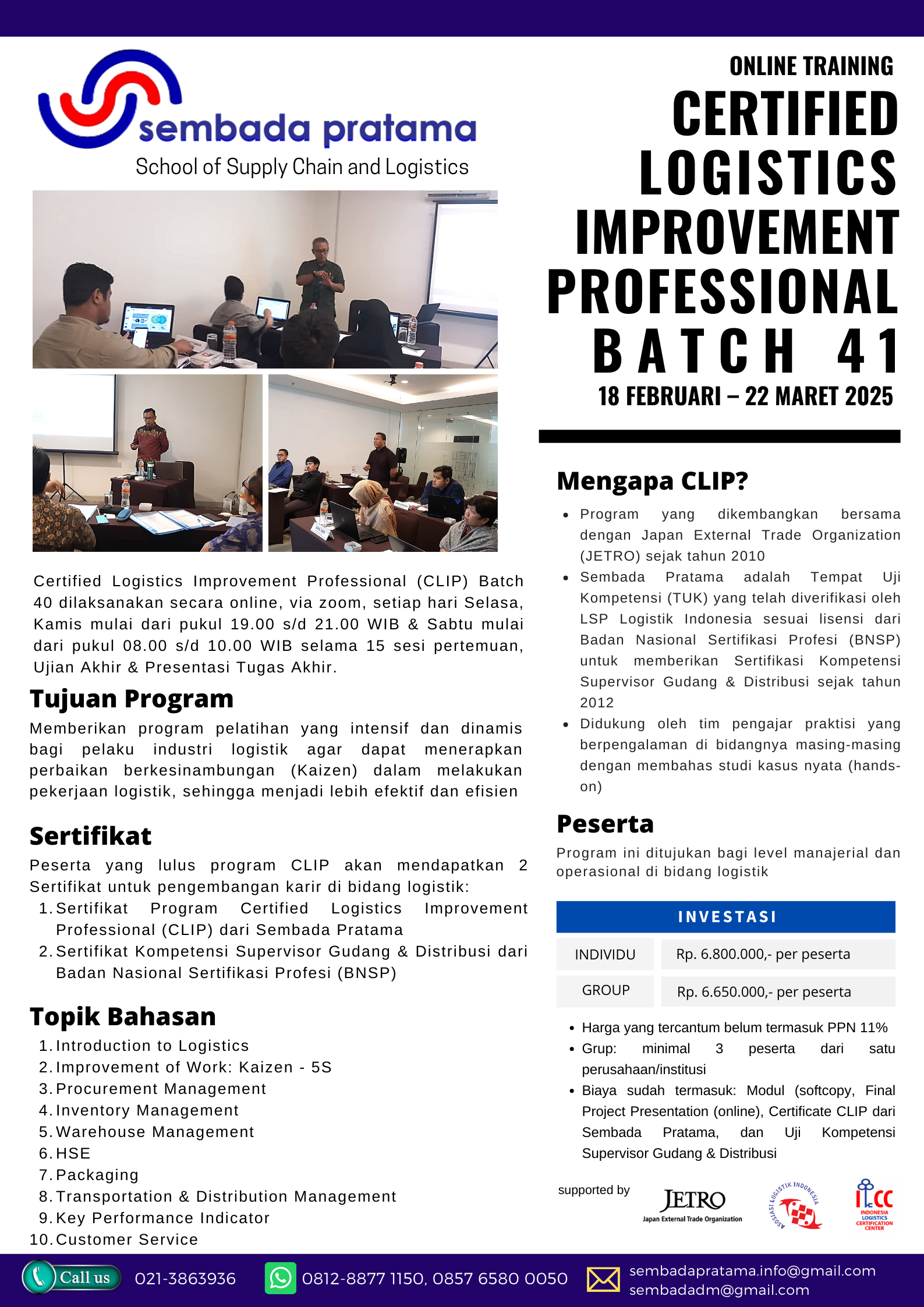 | Judul Event | : | [E-Training & Certification] Certified Logistics Improvement Professional (CLIP Batch 41) - 18 Februari 2025 |